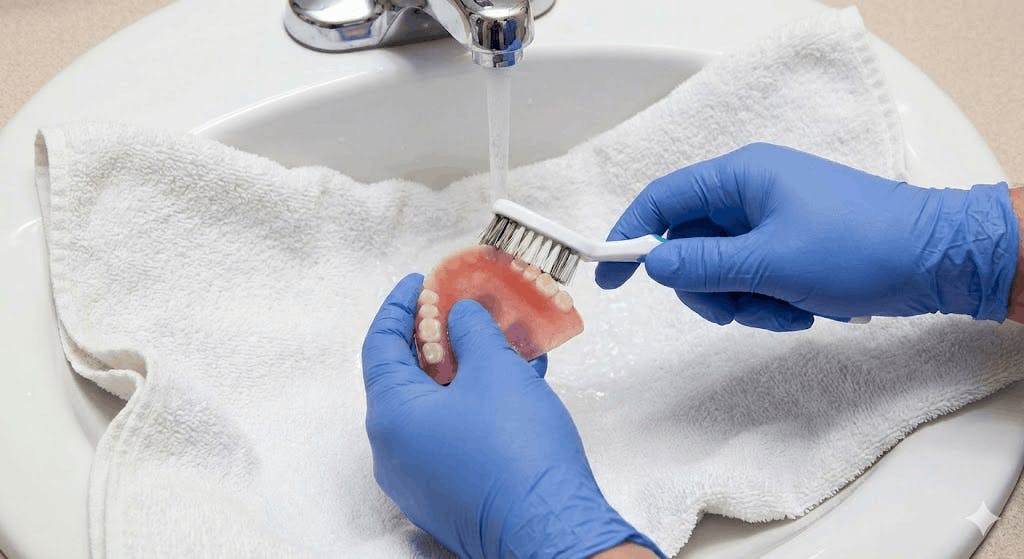• Hold the denture over a basin of water or a folded towel to prevent breakage if it falls.